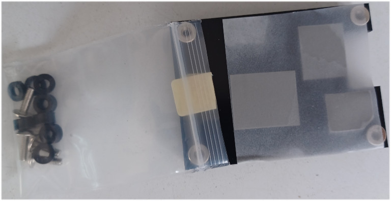 Das Tütchen mit Schrauben und Abstandshaltern ist an der Unterseite des Kühlers angeklebt.
