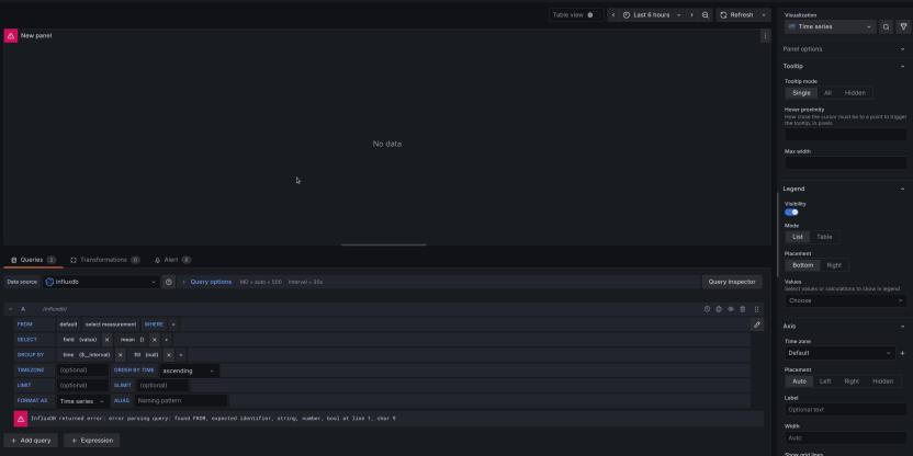 Im oberen Teil, der momentan noch „no data“ anzeigt, wird später der Graph angezeigt. Darunter befindet sich die Daten-Konfiguration des Graph und auf der rechten Seite eine Sidebar zur optischen Konfiguration.